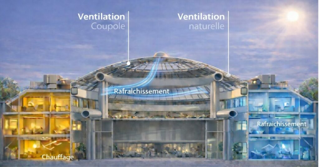 A la mi-saison, l’énergie produite pour rafraichir les zones irradiées par le soleil sera transférée vers les zones ombragées nécessitant du chauffage.